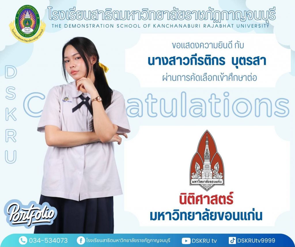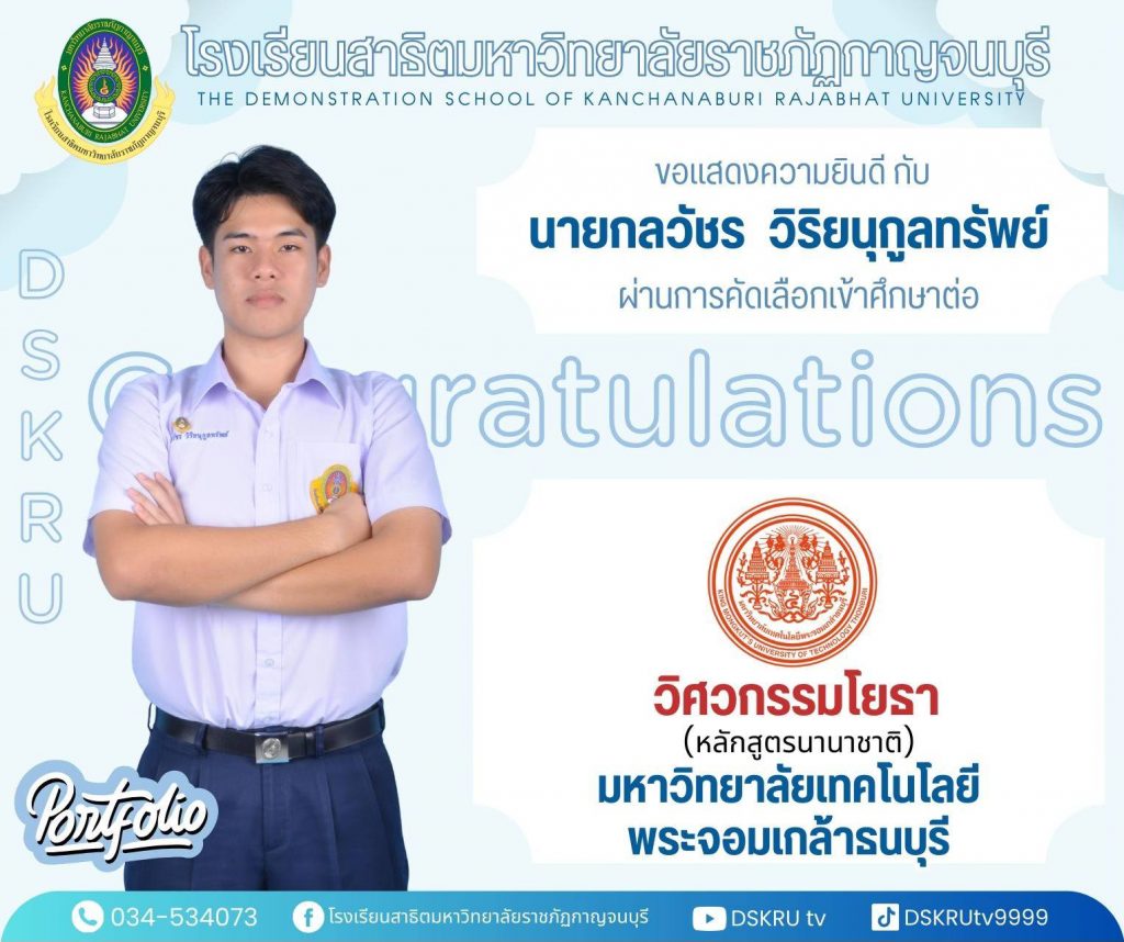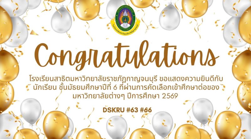 แสดงความยินดีกับนักเรียน ชั้นมัธยมศึกษาปีที่ 6 December 25, 2025January 21, 2026 โรงเรียนสาธิตมหาวิทยาลัยราชภัฏกาญจนบุรี ขอแสดงความยินดีกับนักเรียน ชั้นมัธยมศึกษาปีที่ 6 ที่ผ่านการคัดเลือกเข้าศึกษาต่อของมหาวิทยาลัยต่างๆ ปีการศึกษา 2569 ยินดีด้วยนะครับทุกคน รับชมเพิ่มเติม…..