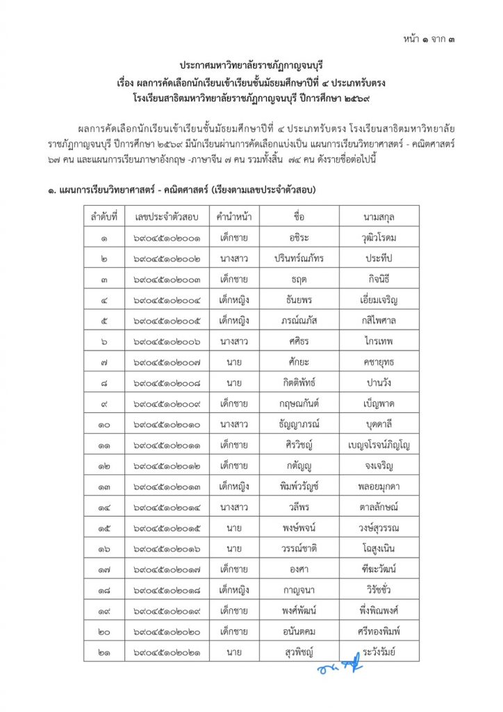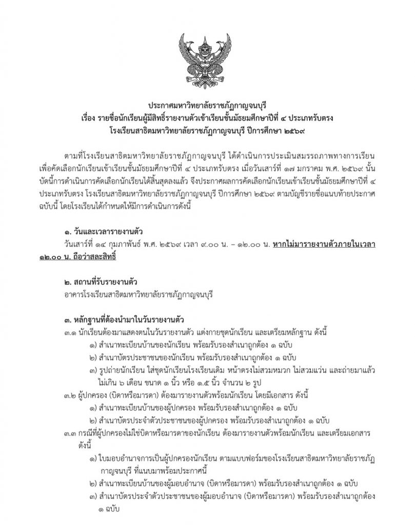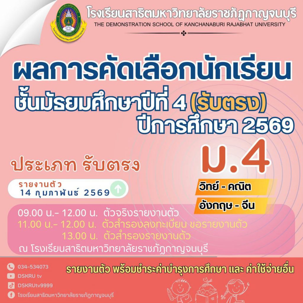ตามที่โรงเรียนสาธิตมหาวิทยาลัยราชภัฏกาญจนบุรี ได้ดำเนินการประเมินสมรรถภาพทางการเรียน เพื่อคัดเลือกนักเรียนเข้าเรียนชั้นมัธยมศึกษาปีที่ 4 ประเภทรับตรง เมื่อวันเสาร์ที่ 17 มกราคม พ.ศ. 2569 นั้น บัดนี้การดำเนินการคัดเลือกนักเรียนได้สิ้นสุดลงแล้ว จึงประกาศผลการคัดเลือกนักเรียนเข้าเรียนชั้นมัธยมศึกษาปีที่ 4 โรงเรียนสาธิตมหาวิทยาลัยราชภัฏกาญจนบุรี ปีการศึกษา 2569 ตามบัญชีรายชื่อแนบท้ายประกาศฉบับนี้ โดยโรงเรียนได้กำหนดให้มีการดำเนินการดังนี้
