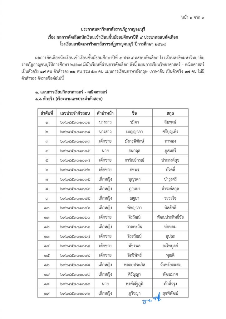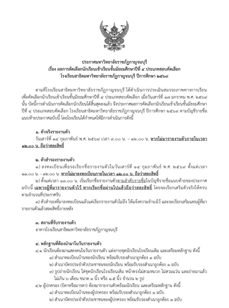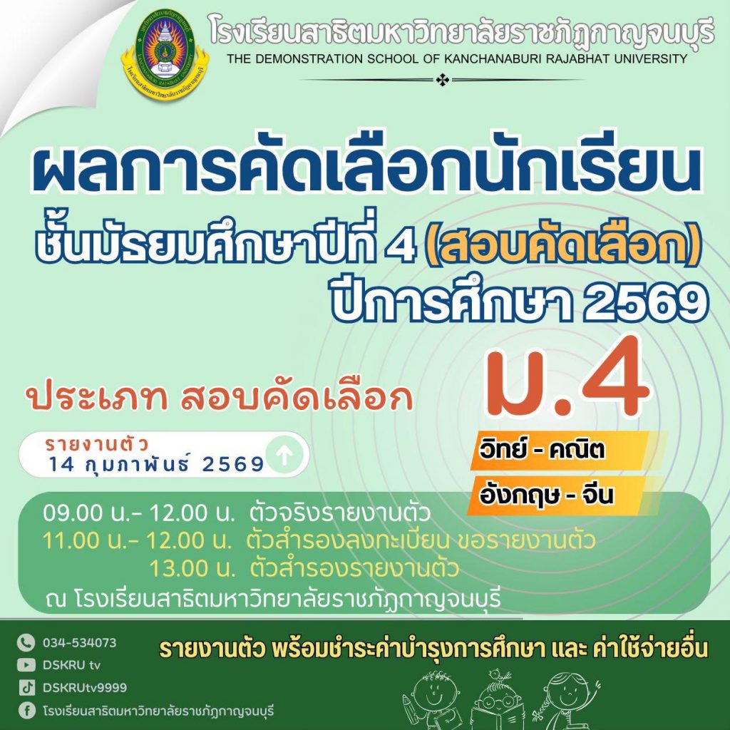 ตามที่โรงเรียนสาธิตมหาวิทยาลัยราชภัฏกาญจนบุรี ได้ดำเนินการประเมินสมรรถภาพทางการเรียน เพื่อคัดเลือกนักเรียนเข้าเรียนชั้นมัธยมศึกษาปีที่ 4ประเภทสอบคัดเลือก เมื่อวันเสาร์ที่ 17 มกราคม พ.ศ. 2569 นั้น บัดนี้การดำเนินการคัดเลือกนักเรียนได้สิ้นสุดลงแล้ว จึงประกาศผลการคัดเลือกนักเรียนเข้าเรียนชั้นมัธยมศึกษาปีที่ 4 โรงเรียนสาธิตมหาวิทยาลัยราชภัฏกาญจนบุรี ปีการศึกษา 2569 ตามบัญชีรายชื่อแนบท้ายประกาศฉบับนี้ โดยโรงเรียนได้กำหนดให้มีการดำเนินการดังนี้