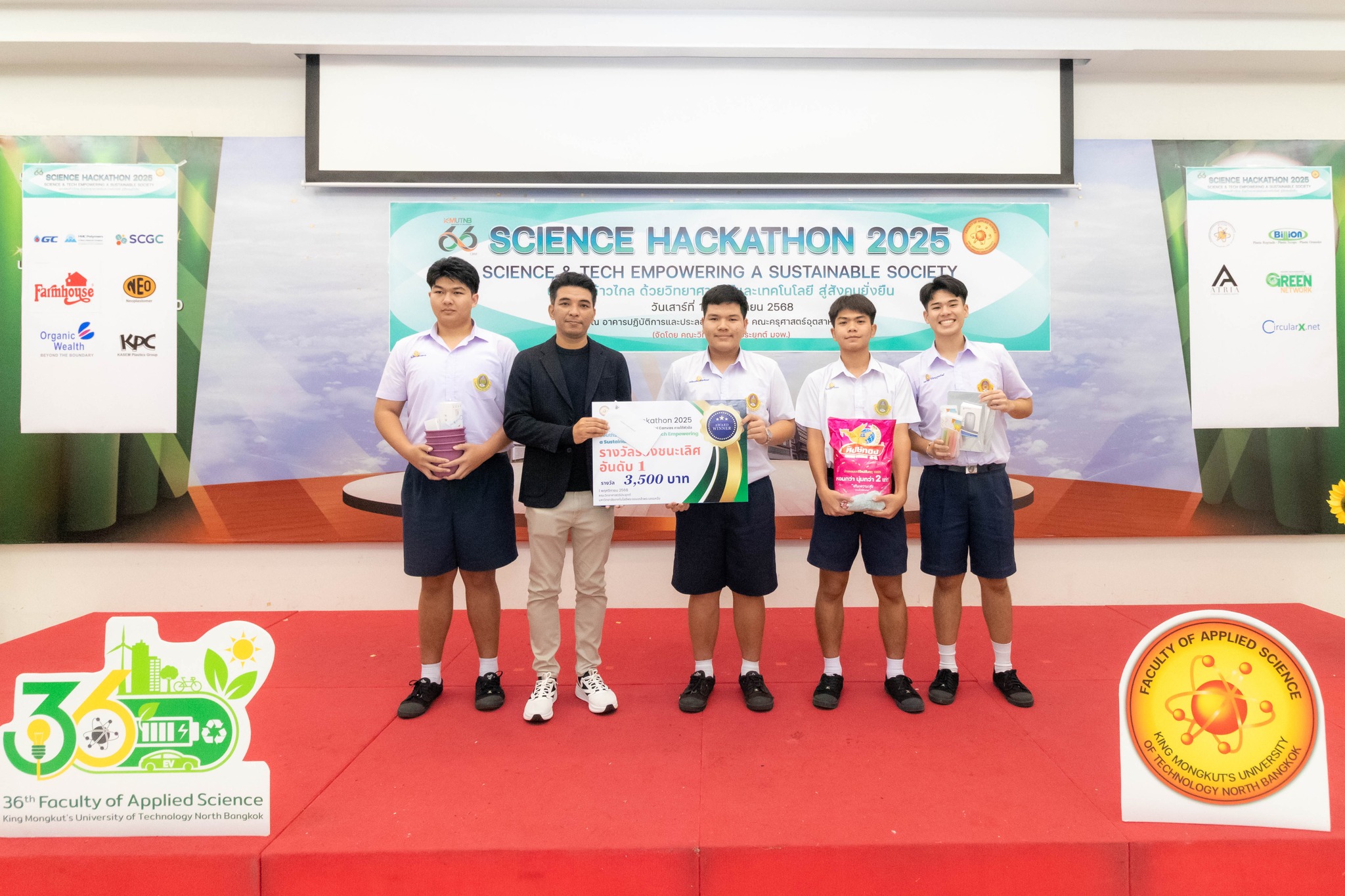 จากการแข่งขัน Science Hackathon 2025 ภายใต้หัวข้อ SCIENCE & TECH EMPOWERING A SUSTAINABLE SOCIETY (เยาวชนก้าวไกล ด้วยวิทยาศาสตร์และเทคโนโลยี สู่สังคมยั่งยืน) เพื่อให้นักเรียนมัธยมศึกษาตอนปลาย ชั้นปีที่ 4 – 6 ได้ทำกิจกรรมในรูปแบบ Design Thinking Workshop ออกแบบ Business Model Canvas และประกวดผลงานโดยนำเสนอแบบ Pitching โดยมีทีมนักเรียนที่มาเข้าร่วม จำนวน 45 ทีม จำนวน 180 คน จากโรงเรียนในเขตกรุงเทพมหานคร ปริมณฑล และ ต่างจังหวัด ในวันที่ 1 พฤศจิกายน 2568